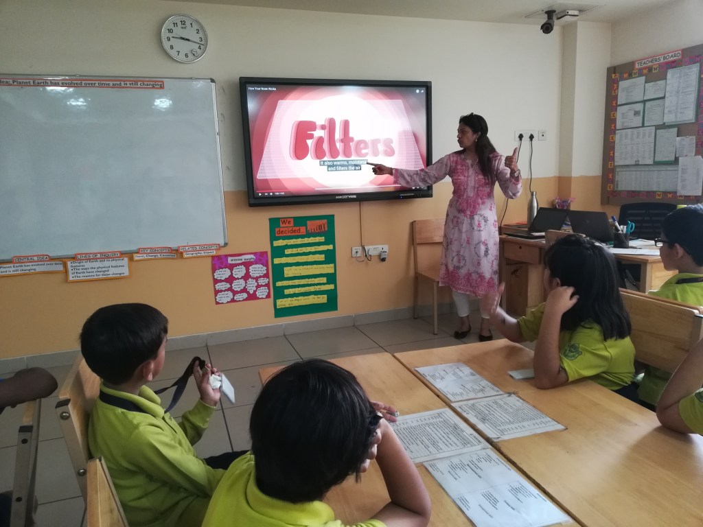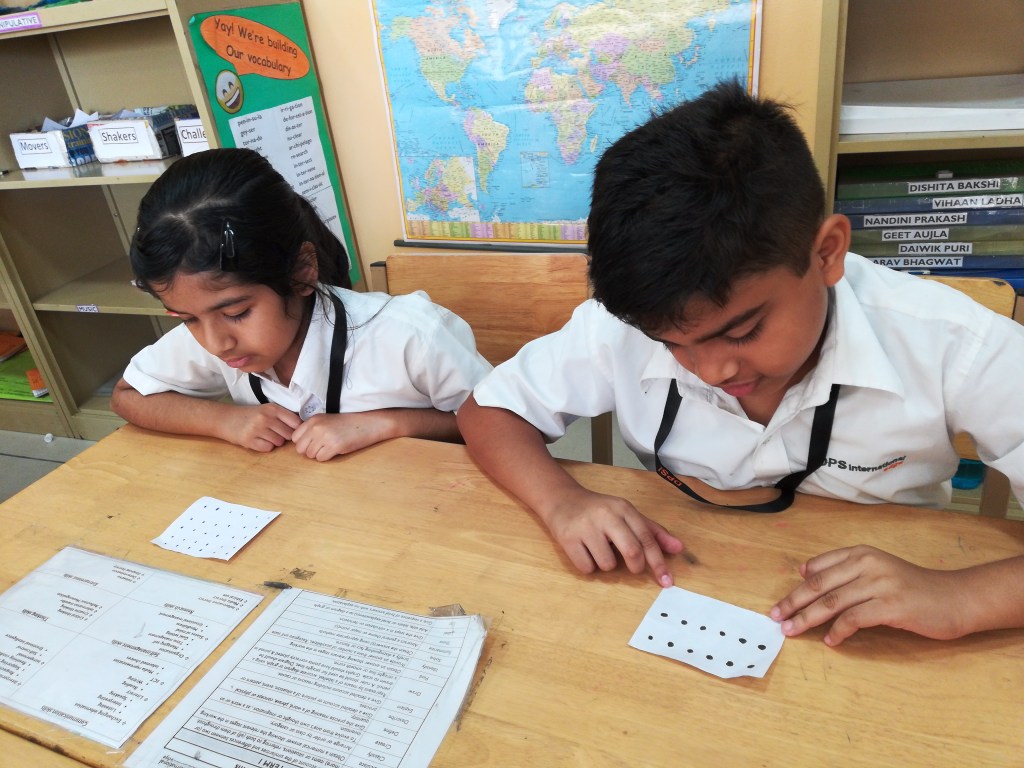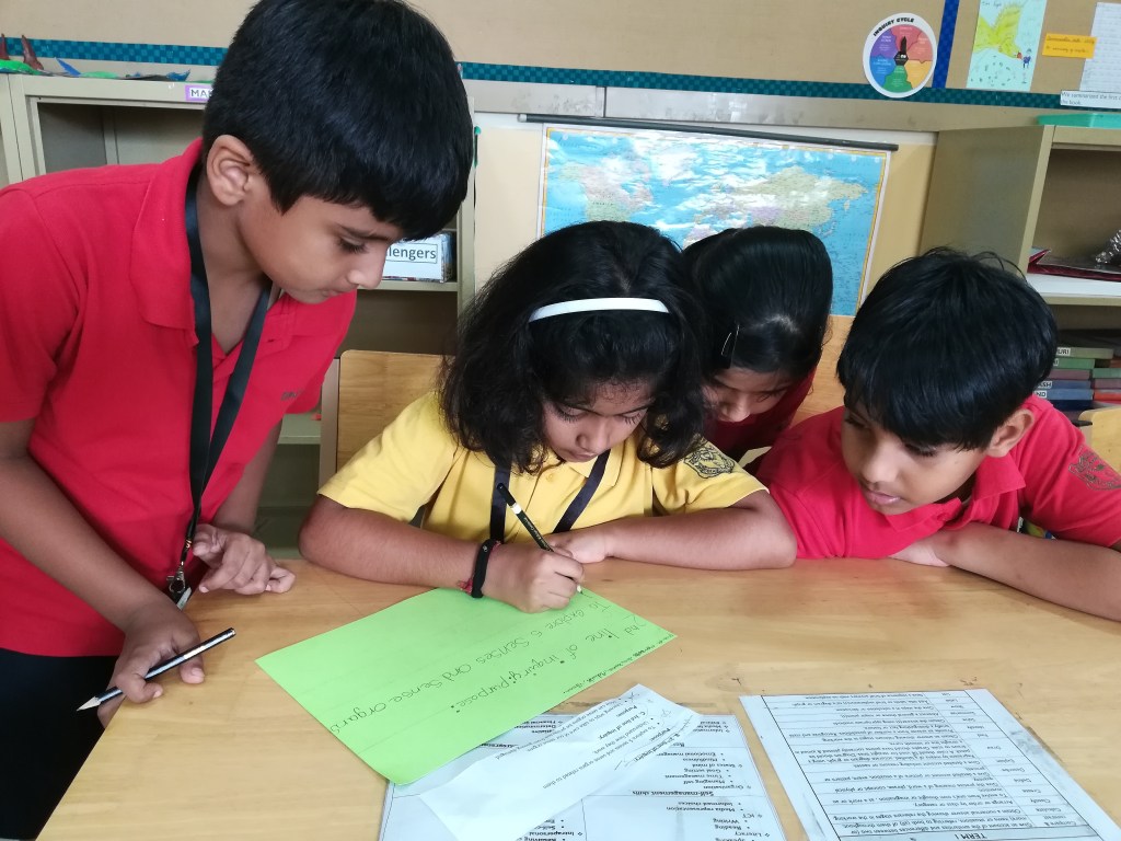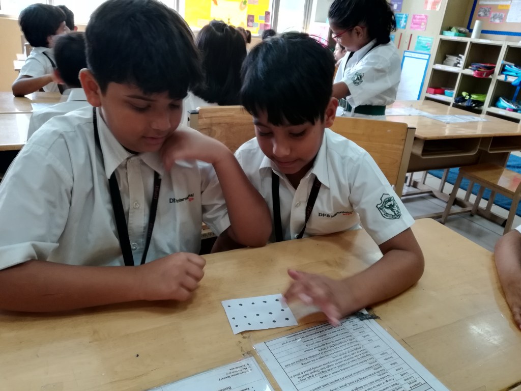 The students were tuned into multiplication with a story of the ‘one hundred hungry ants”. Through a card activity they identified ‘arrays’ and the number of items in each row. They reflected on their understanding by a visible thinking routine – CONNECT EXTEND CHALLENGE. They furthered their comprehension of the terms ‘factors and products’ and practiced time tables for 2,3,4,5.