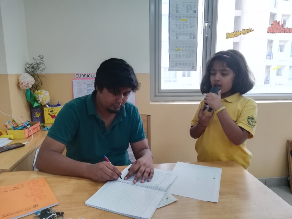 To enhance their reading skills they read chotee ‘e’ ki maatraa wale shabd.To enhance their writing skills they did worksheet of chotee ‘e’ ki maatraa wale shabd . They watched hindi story ‘Bandar aur magarmachh’. To enhance their listening they listened hindi story ‘Totaa’. They did ‘Jungle activity’ in which they cut and paste the picture of animals and birds and write their names.